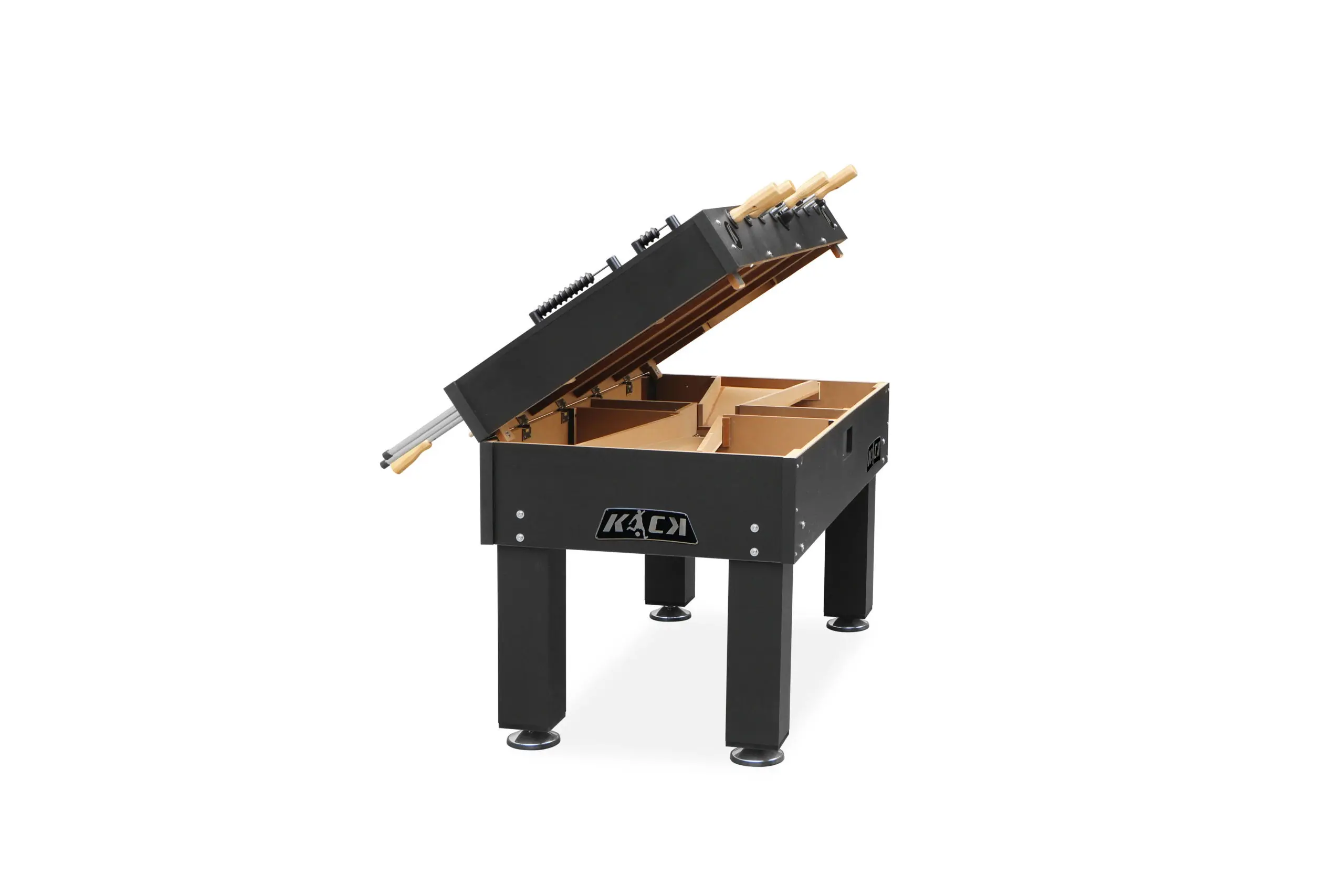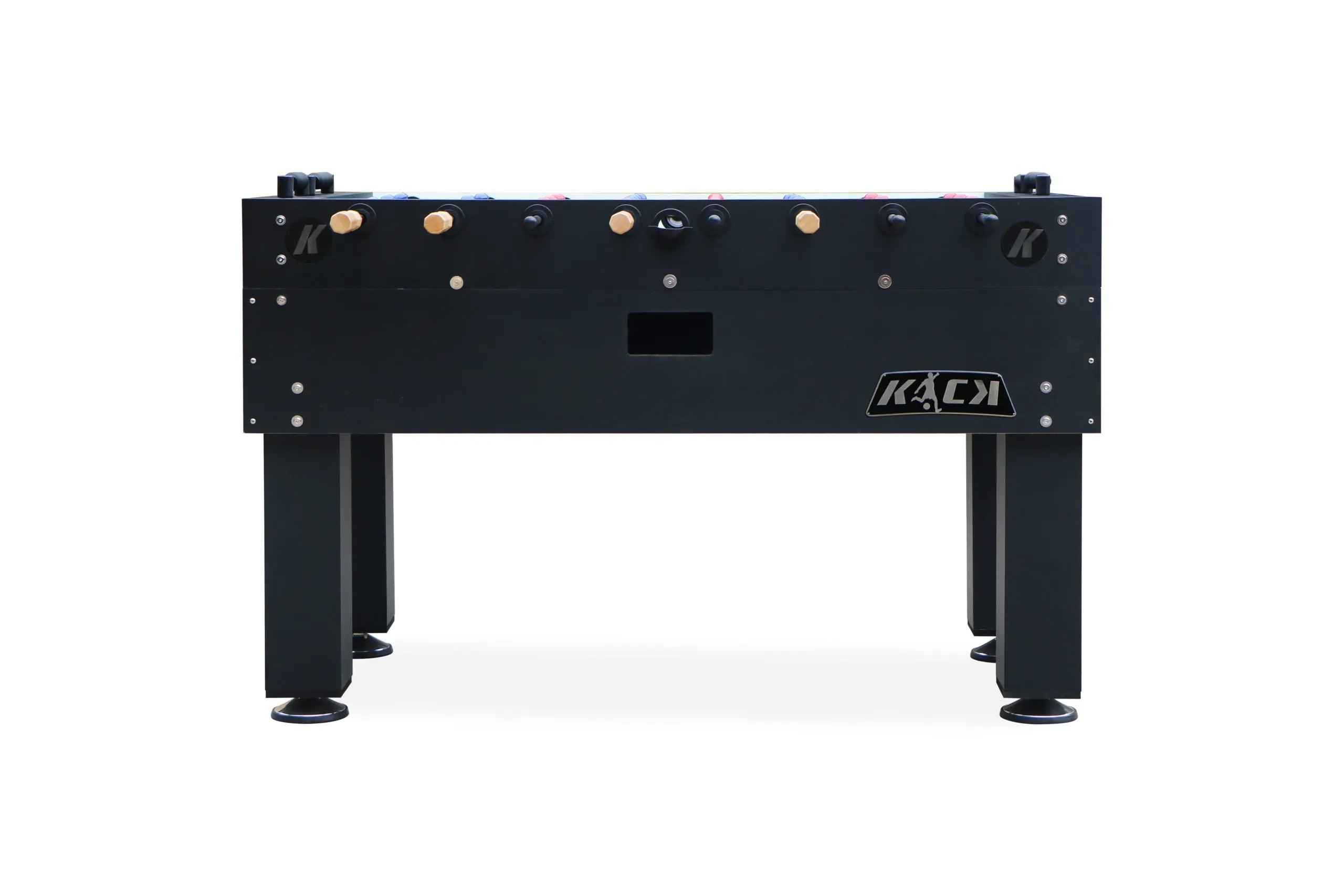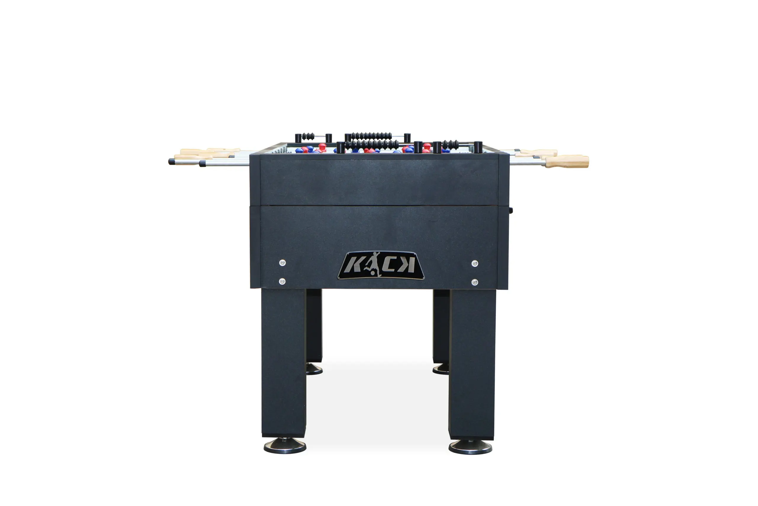 The sturdy cabinet of KICK Titan Foosball Table comes in 3 different color options so it will match any room in your home. The black square legs look fantastic. The entire playing surface is straight at all times with the help of precise leg levelers. Rod Lubricant on the House: Available upon request.